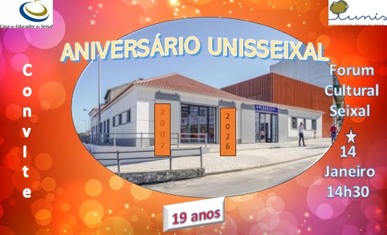 Convite O Conselho Diretivo da Unisseixal tem o prazer de o convidar para o XIX Aniversário da Universidade Sénior do Seixal, que terá lugar no Fórum Municipal do Seixal, no próximo dia 14 de janeiro de 2026, pelas 14:30 horas. Muito nos honraria contar com a sua presença. A Reitora Mariana Mareco Notas: A 14 de …